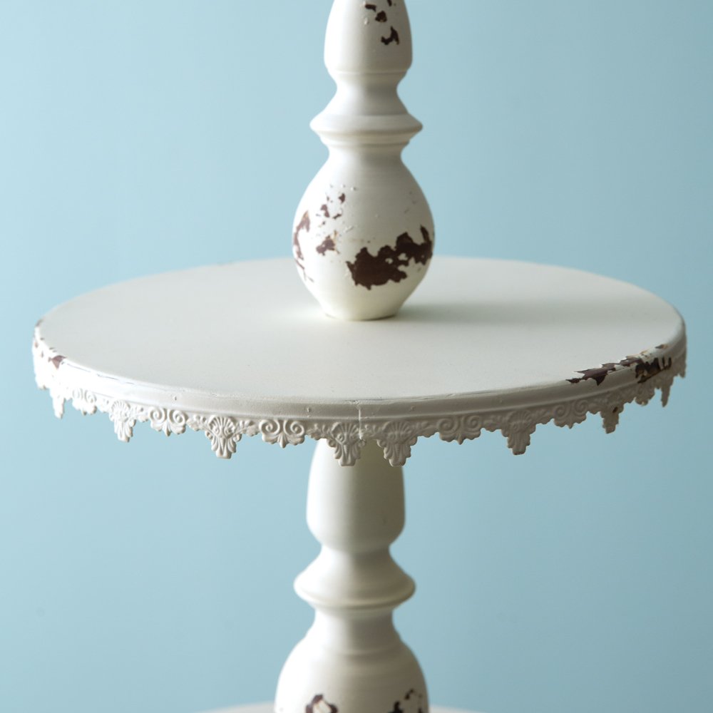 Display desserts for a wedding or small items for your store on this feminine display stand. Item features a loop to carry and is a large piece measuring almost 3 ft tall. Display stand is made of metal and is not food safe. Use with doilies or liners.